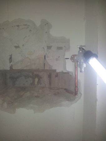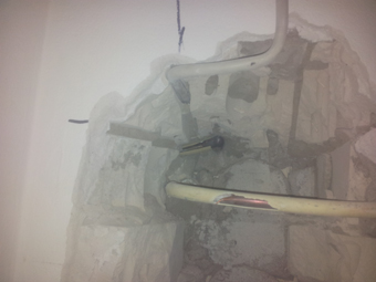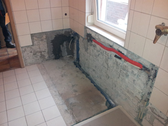 | Auch hier waren wieder punktgenaue Stemmarbeiten an einer tragenden Wand notwendig, um an alte dichtgesetzte Leitungen zu gelangen. | |