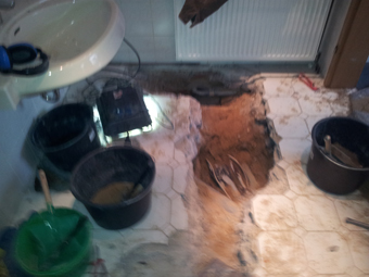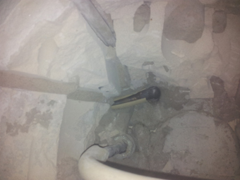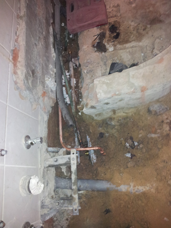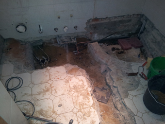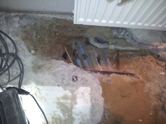 | Punktgenaue Stemmarbeiten: hier musste der Boden wegen alter und defekter Leitungen geöffnet werden, Vorsicht war geboten, da hier auch noch alte, aber intakte Tonrohre verliefen, die auf alle Fälle nicht beschädigt werden durften. | |