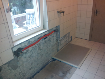 | Teilsanierung eines Badezimmers: hier wurden die nicht mehr benötigte Badewanne und die alte Dusche mit hohem Einstieg entfernt. Eine neue flache Duschtasse mit entsprechender Duschabtrennung wurden wieder eingebaut und der gewonnene Platz der ausgebauten Badewanne bietet nun Platz für Waschmaschine und Trockner, die vorher im Keller untergebracht waren. Nun hat der Kunde alles auf einer Ebene und somit seniorengerecht. | |