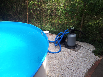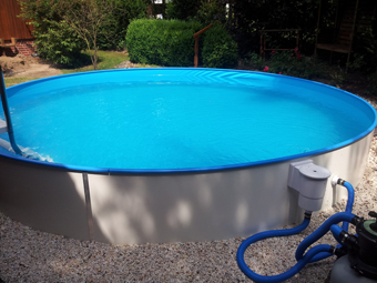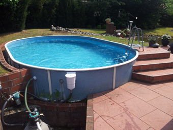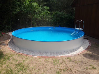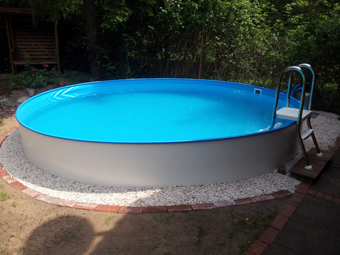 | Hier ein im Sommer 2015 entstandener Swimming-Pool, halb in die Erde eingelasssen als Rundbecken mit einem Durchmesser von 4,50 Mtr. und 1,20 Mtr. Wassertiefe. | |