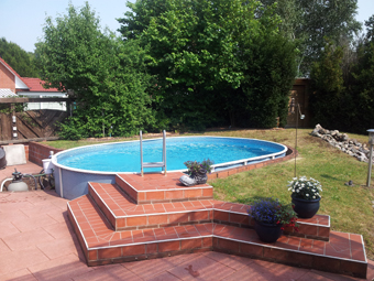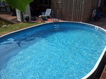 | Schon seit über 15 Jahren kühle ich mich im eigenen Swimming-Pool ab, hier komplett in die Erde eingelassen als Ovalpool in der Größe 5,50 x 3,60 Mtr. und 1,20 Mtr. Wassertiefe. | |